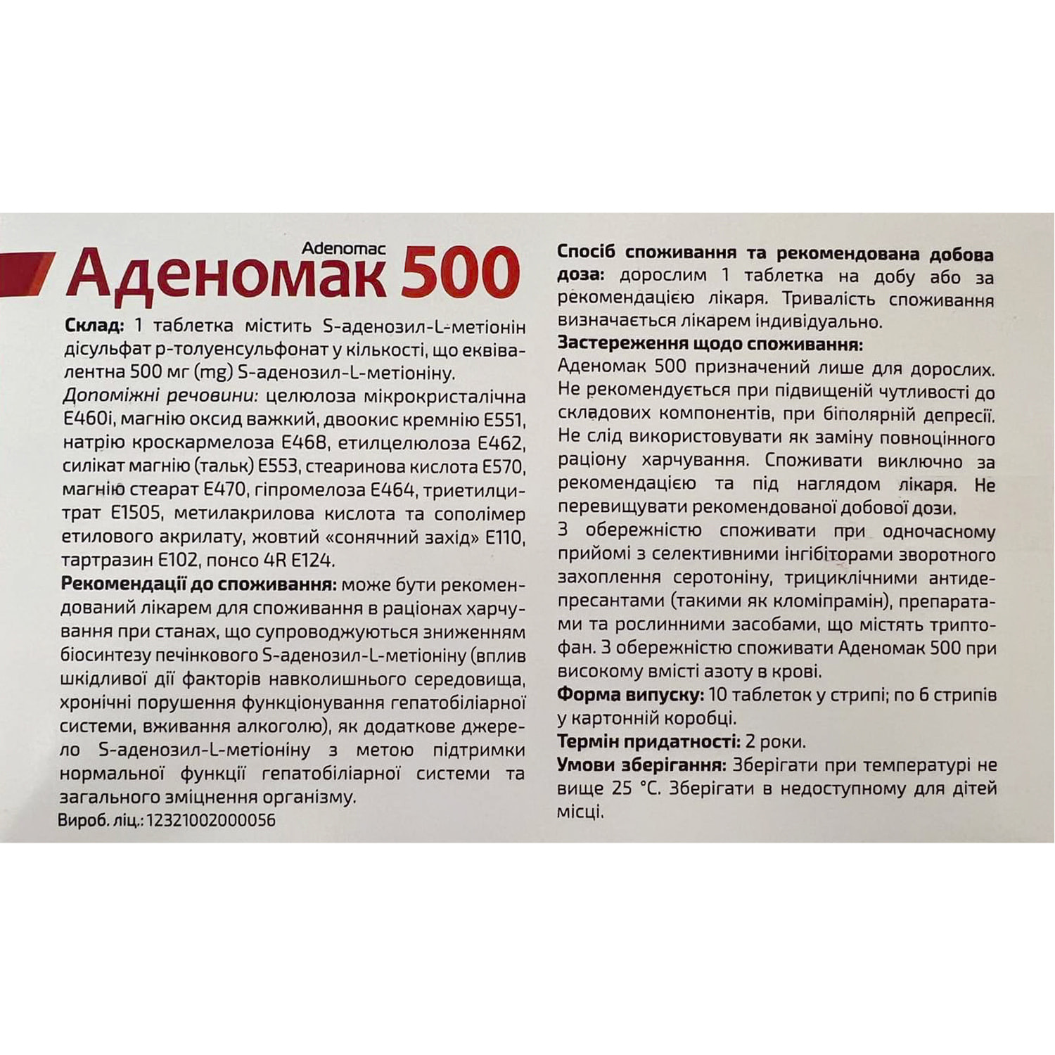 Склад1 таблетка містить S-аденозил-L-метіонін дісульфат р-толуенсульфонат у кількості, що еквівалентна 500 мг (mg) S-аденозил-L-метіоніну. Допоміжні речовини: целюлоза мікрокристалічна Е460і, магнію оксид важкий, двоокис кремнію Е551, натрію кроскармелоза Е468, етилцелюлоза Е462, силікат магнію (тальк) Е553, стеаринова кислота Е570, магнію стеарат Е470, гіпромелоза Е464, триетилцитрат Е1505, метилакрилова кислота та сополімер етилового акрилату, жовтий «сонячний захід» Е110, тартразин Е102, понсо 4R Е124. ОписS-аденозил-L-метіонін (адеметіонін) – натуральна амінокислота, що присутня практично у всіх тканинах і рідинах організму. Адеметіонін, перш за все, діє як коензим та донор метильної групи у багатьох реакціях трансметилювання, що є важливим метаболічним процесом у людини. Перенесення метильних груп (трансметилювання) адеметіоніну також є важливим метаболічним процесом при будуванні фосфоліпідної мембрани клітин та відіграє роль у плинності мембран. Адеметіонін здатний проникати через гематоенцефалічний бар’єр. Високі концентрації адеметіоніну впливають на процеси трансметилювання, які є дуже важливими у мозковій тканині, завдяки впливу на метаболізм катехоламінів (допаміну, адреналіну, норадреналіну), індоламінів (серотоніну, мелатоніну) та гістаміну. Адеметіонін є попередником в утворенні фізіологічних сульфурованих сполук (цистеїну, таурину, глютатіону, коензиму А та ін.) у реакціях транссульфурування. Глютатіон, найпотужніший антиоксидант, є важливим компонентом для печінкової детоксикації. Адеметіонін підвищує рівень глютатіону при станах ураження печінки як алкогольного, так і неалкогольного ґенезу. Абсорбція. Після внутрішнього застосування кишковорозчинних таблеток адеметіоніну максимальна плазмова концентрація є дозозалежною, становить 0,5-1 мг/л та досягається через 3-5 годин після прийому разової дози від 500 мг до 1000 мг. Плазмова концентрація знижується до початкового значення протягом 24 годин. Біодоступність після перорального застосування підвищується, якщо адеметіонін застосовувати між прийомами їжі. Метаболізм. Реакції, у результаті яких продукується, засвоюється та регенерується адеметіонін, називаються циклом адеметіоніну. На першому етапі цього циклу адеметіонінзалежна метилаза використовує адеметіонін як субстрат для продукування S-аденозил-гомоцистеїну, який потім гідролізується до гомоцистеїну та аденозину за допомогою S-аденозил-гомоцистеїн-гідролази. Гомоцистеїн, у свою чергу, піддається зворотній трансформації до метіоніну шляхом перенесення метильної групи від 5-метилтетрагідрофолату. Зрештою, метіонін може бути перетворений в адеметіонін, завершуючи цикл. Рекомендації щодо застосуванняМоже бути рекомендований лікарем для споживання в раціонах харчування при станах, що супроводжуються зниженням біосинтезу печінкового S-аденозил-L-метіоніну (вплив шкідливої дії факторів навколишнього середовища, хронічні порушення функціонування гепатобіліарної системи, вживання алкоголю), як додаткове джерело S-аденозил-L-метіоніну з метою підтримки нормальної функції гепатобіліарної системи та загального зміцнення організму. ЗастереженняАденомак 500 призначений лише для дорослих. Не рекомендується при підвищеній чутливості до складових компонентів, при біполярній депресії. Не слід використовувати як з
