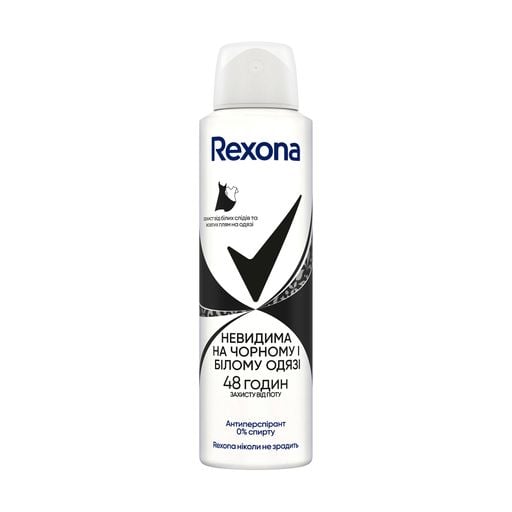 Антиперспірант-аерозоль Rexona Invisible On Black+White Clothes 150 мл забезпечує захист від поту та неприємного запаху протягом 48 годин. Спеціально розроблений для невидимого захисту — не залишає білих слідів на чорному одязі та жовтих плям на білому.