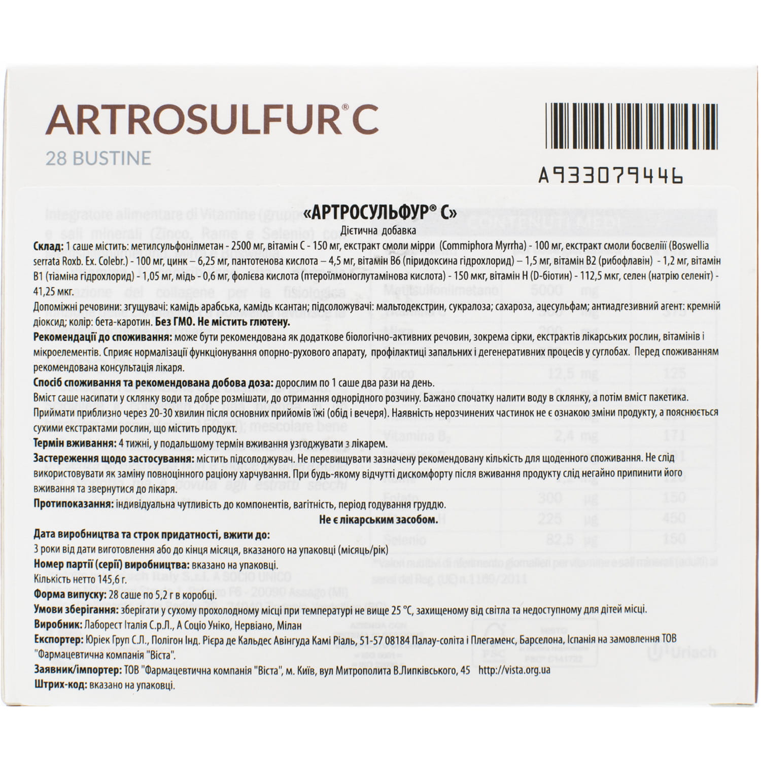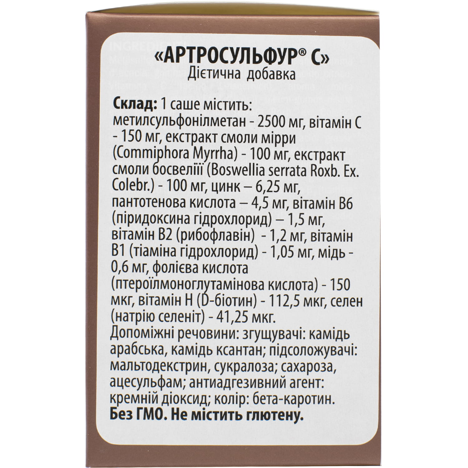 Артросульфур С – це комбінація хондропротектору (метилсульфонілметан – джерело сірки, необхідної для формування колагену хрящів), вітаміну С (кофактору для формування колагену), та екстрактів лікарських рослин, що впливають на інтенсивність запальних процесів.