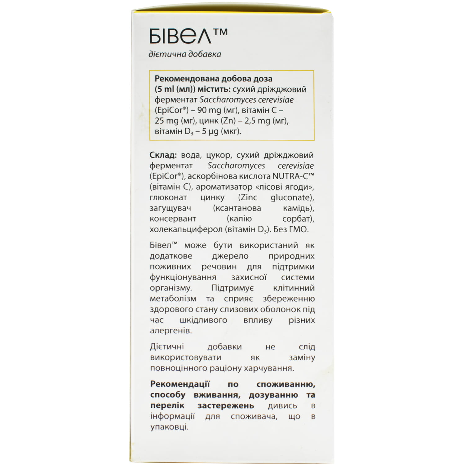 Завдяки унікальному поєднанню вітамінів С і D3, цинку та сухого ферментату з дріжджів EpiCor®, Бівел™ сприяє підвищенню опірності і забезпечує енергетичну підтримку організму під час сезонних застудних захворювань, сприяє укріпленню імунітету та захисту клітин від оксидативного стресу.