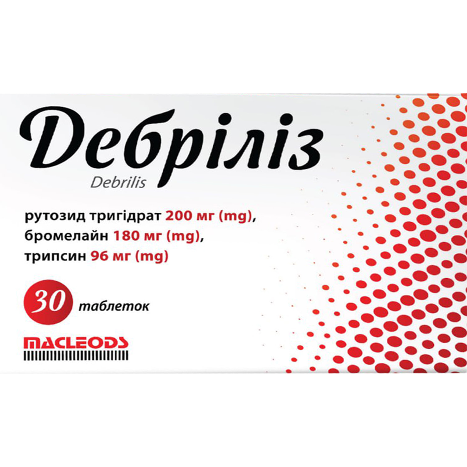 Активні речовини: рутозид тригідрат 200 мг (mg), бромелайн 180 мг (mg), трипсин 96 мг (mg).
