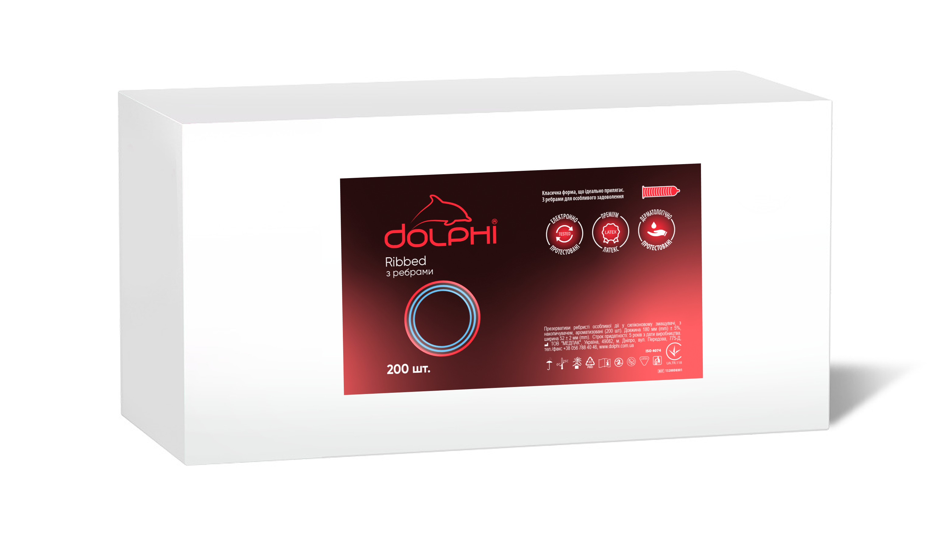 • Dolphi Ribbed мають класичну форму з ребрами на поверхні, класичну довжину 180 (+/-2) мм, ширину 52 (+/-) мм та товщину латексу 0,06 мм.
