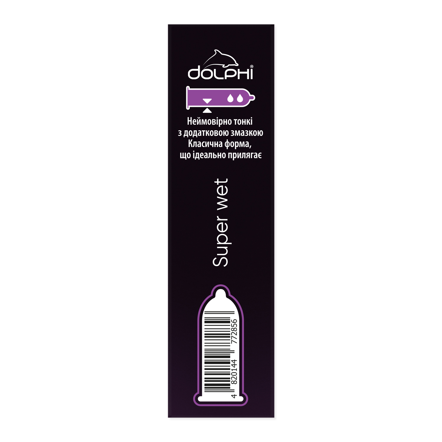 Супертонкі та супервологі Dolphi Super Wet подарують відчуття свободи між партнерами. Кожен рух, кожен дотик дозволить випробувати нову гаму задоволення так, наче вас ніщо не розділяє! Завдяки унікальній технології виробництва презервативи Dolphi Super Wet ще більше зволожені ніжною змазкою, рівномірно розподіленою по всій довжині та забезпечує ще більший комфорт та ще більш природні відчуття.