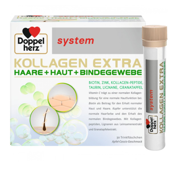 Доппельгерц ® System Колаген Екстра містить комбінацію спеціально підібраних поживних речовин для здоров’я шкіри, волосся та сполучної тканини в зручному флаконі для пиття зі смаком яблука та чорної смородини.