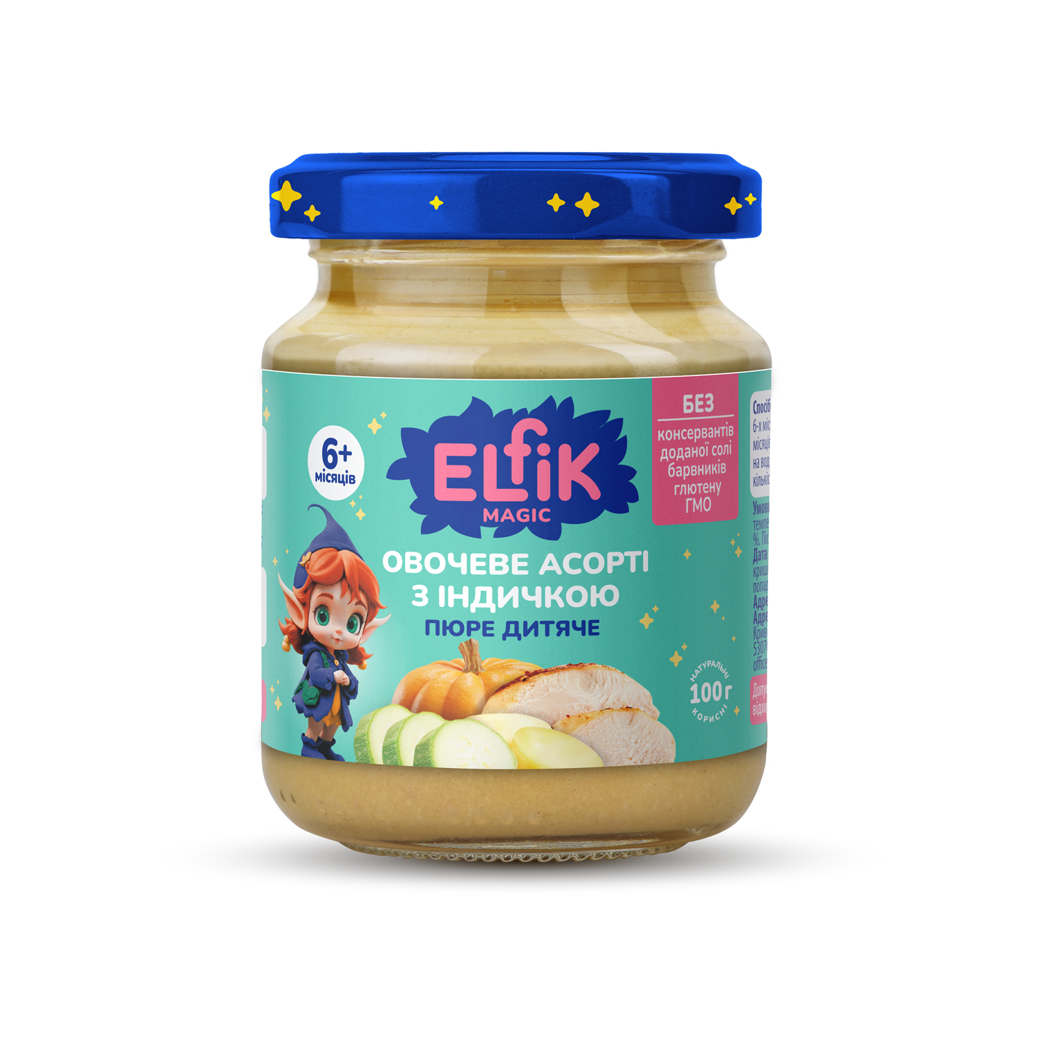 Пюре овочеве асорті з індичкою гомогенізоване для дитячого харчування, стерилізоване ТМ ELFIK MAGIC
