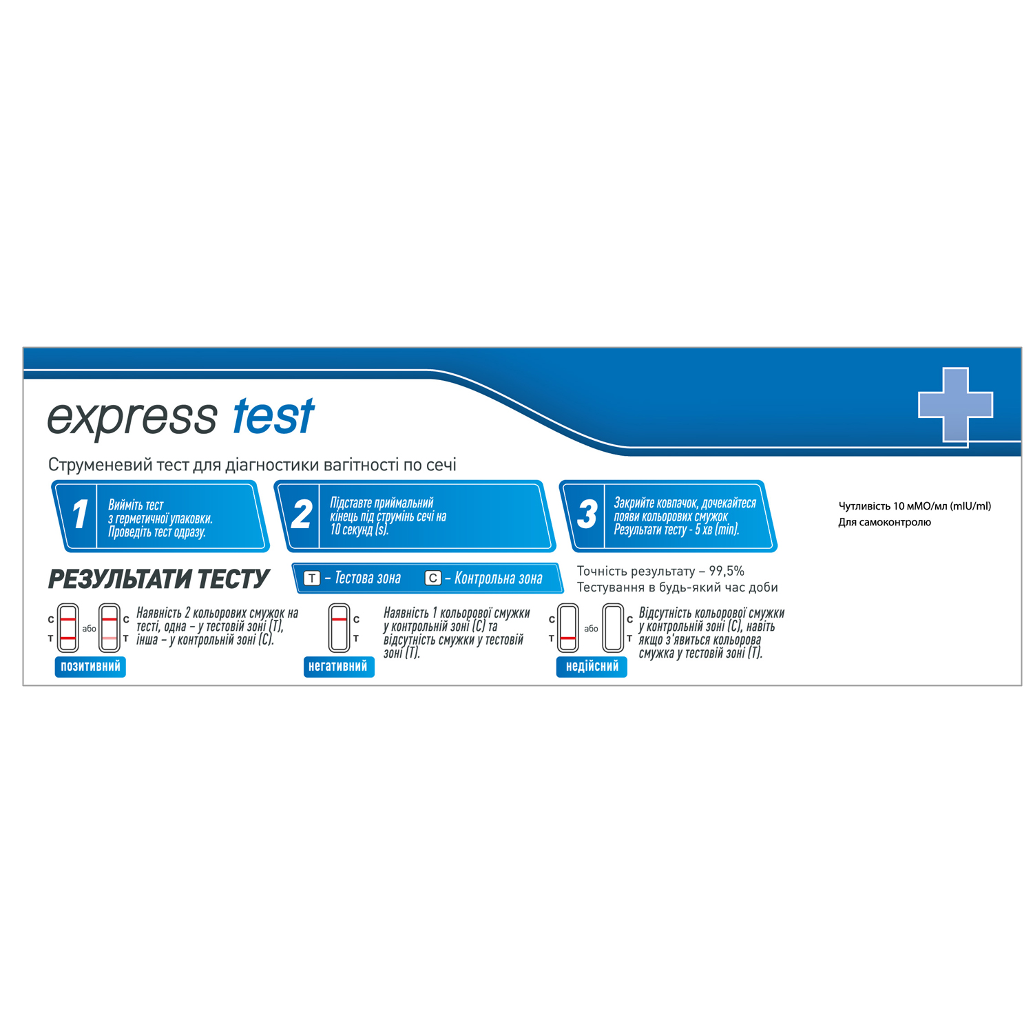Високочутливий струменевий тест на вагітність Express Test, завдяки спеціальній конструкції, дозволяє проводити тестування без збору сечі. Це робить процедуру тестування більш простою та гігієнічною. Тест має високу чутливість 10 мМО/мл, що дає змогу визначати факт настання вагітності вже через 7-10 днів з моменту зачаття чи з 1-го дня затримки з точністю результату – 99,5%.