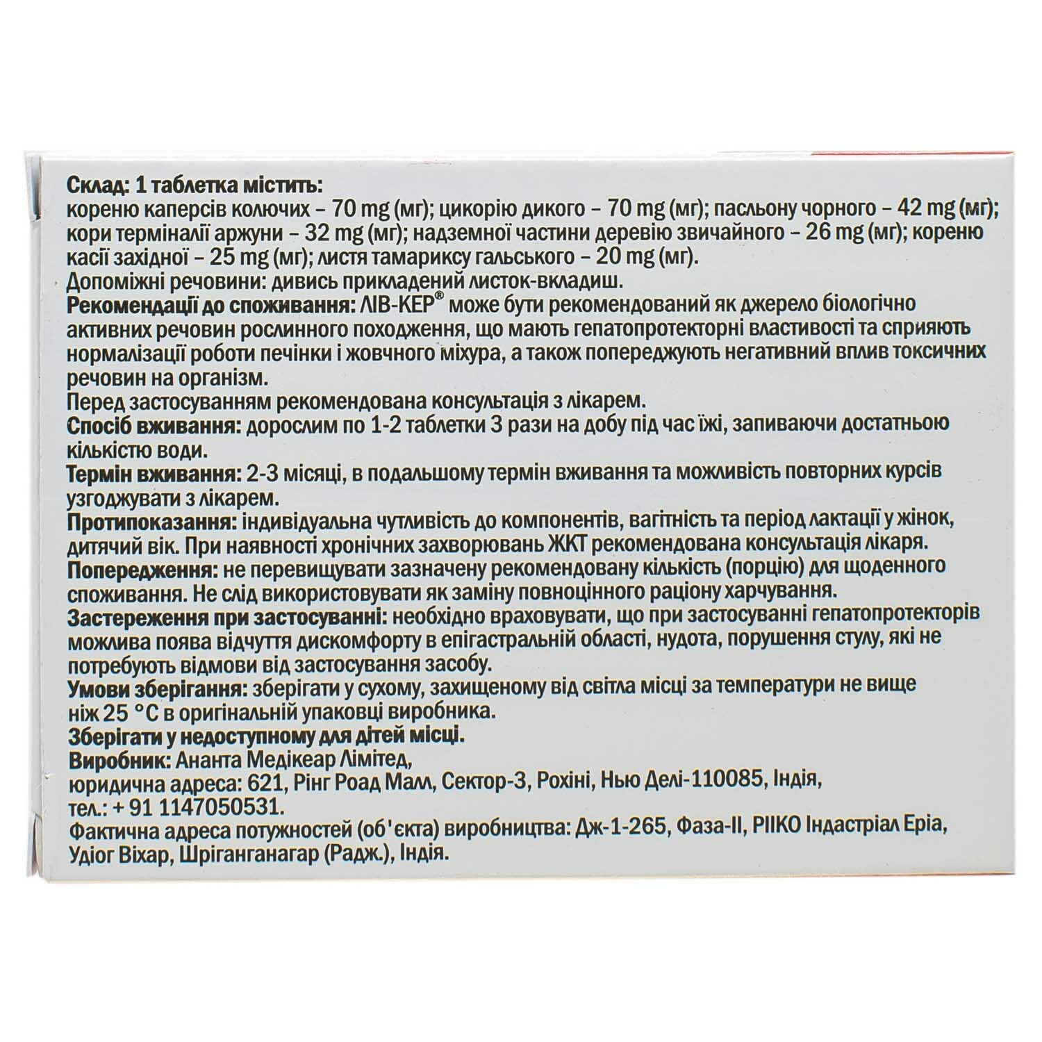 ЛІВ-КЕР® може бути рекомендований як джерело біологічно активних речовин рослинного походження, що мають гепатопротекторні властивості та сприяють нормалізації роботи печінки і жовчного міхура, а також попереджують негативний вплив токсичних речовин на організм.