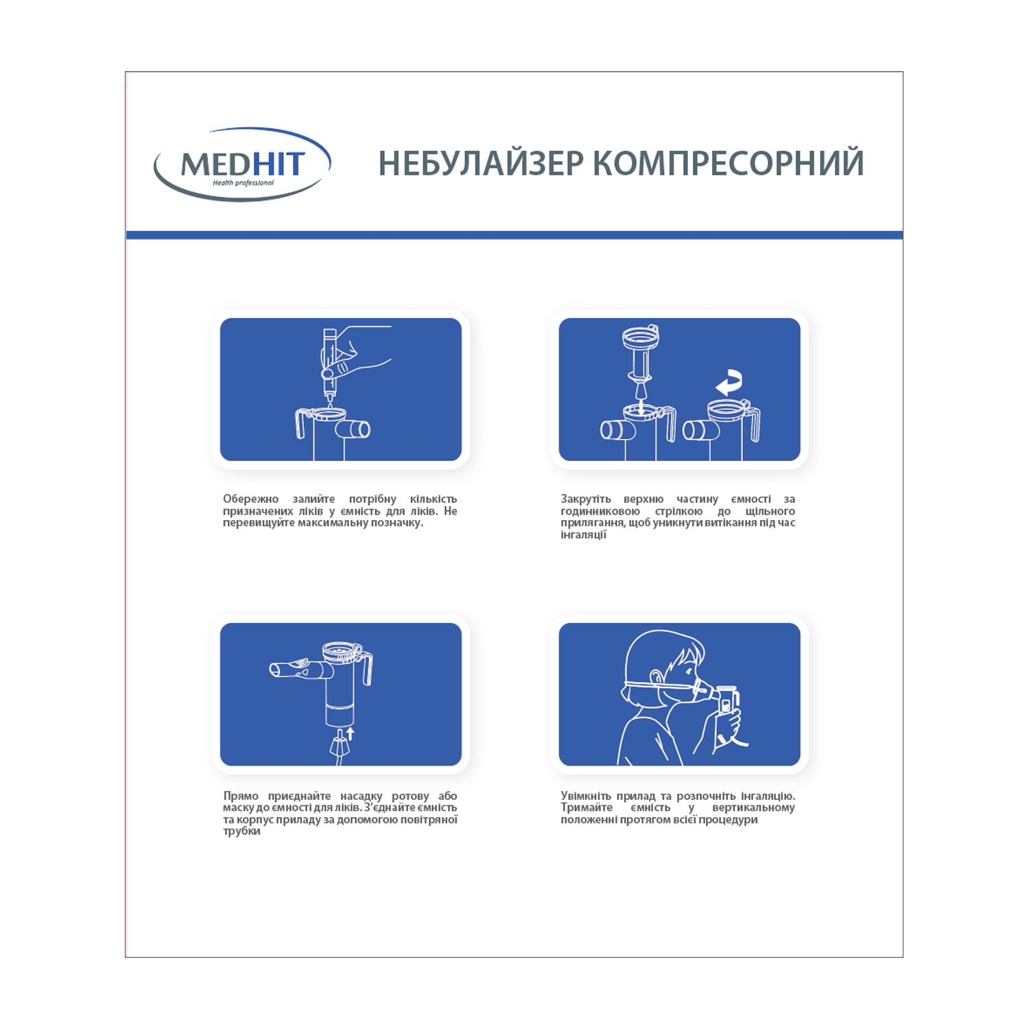 - Комплектація: ємність для ліків, маска для дорослих, насадка для рота, повітряна трубка, набір повітряних фільтрів (5 шт.)