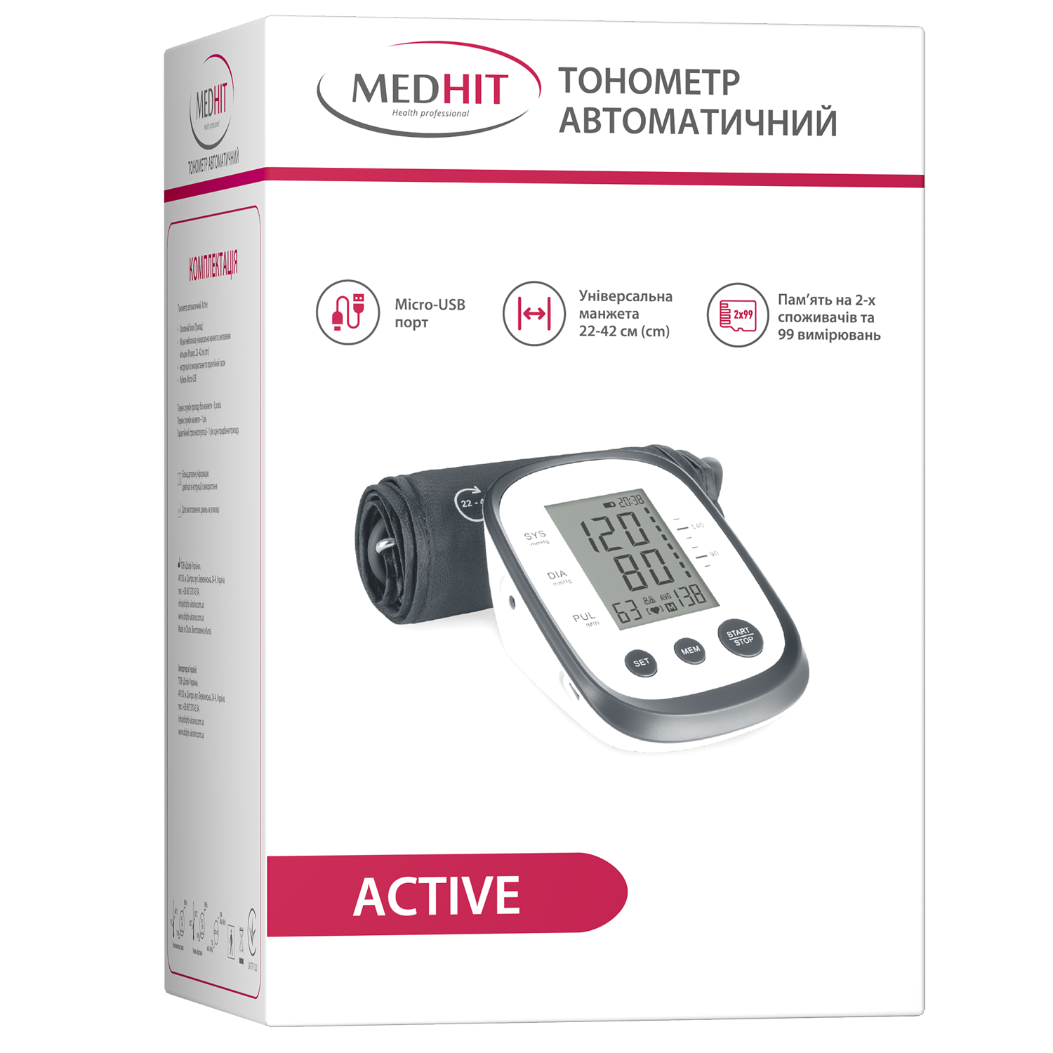 Тонометр ACTIVE має автоматичну систему накачування манжети, цифровий дисплей з великими цифрами, на якому зручно відображаються показники систолічного, діастолічного тиску та частоти пульсу.