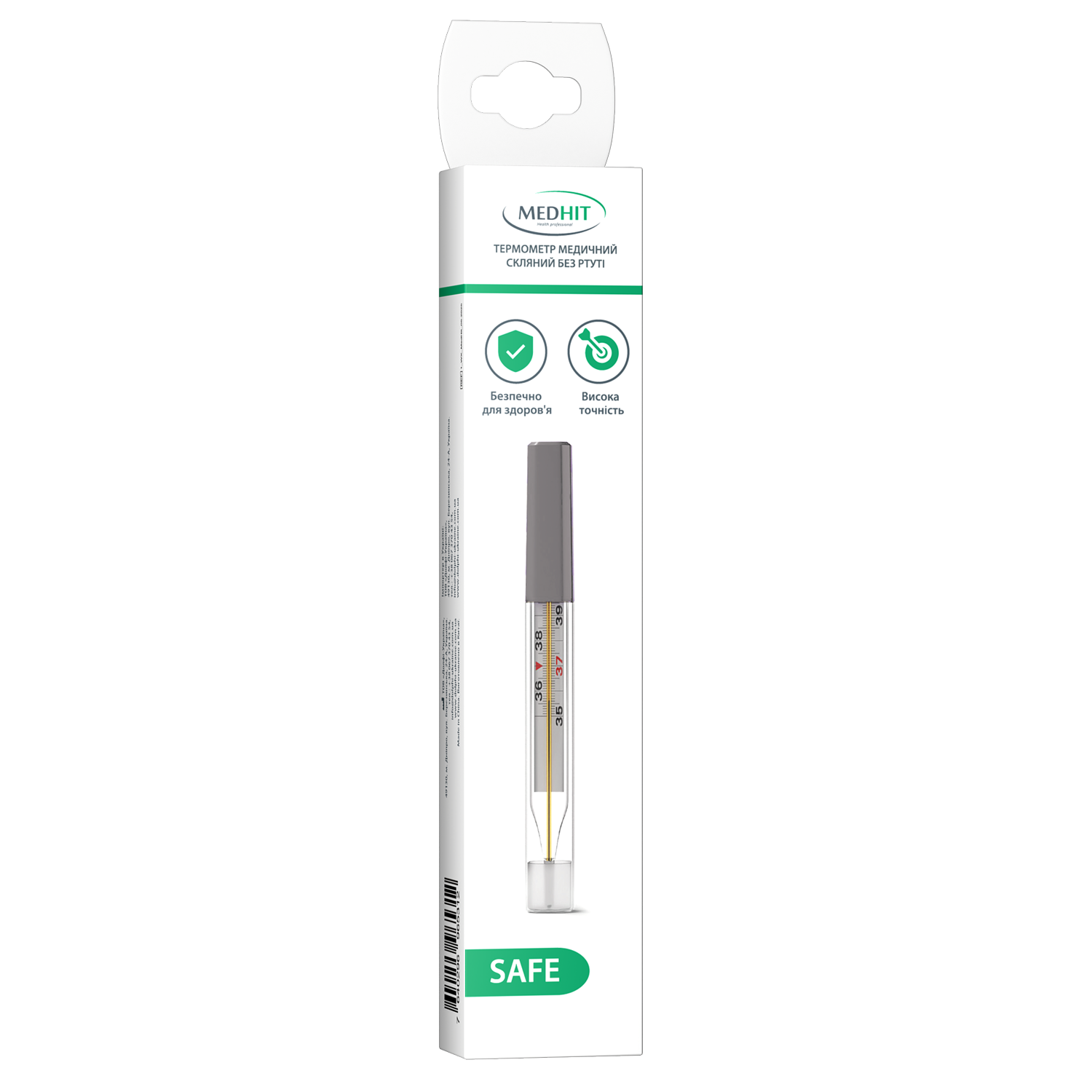 Термометр медичний скляний без ртуті це екологічно безпечний прилад для вимірювання температури тіла. В його основі лежить безпечний сплав галію, що заповнює кінчик скляної трубки і рівномірно змінює свій об’єм залежно від температури, а в середині трубки використовується забарвлений спирт.