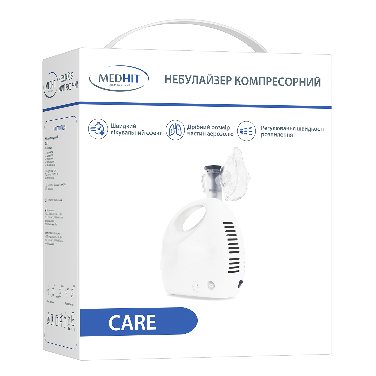 Небулайзер CARE легкий, компактний та простий. Ручка для переносу на упаковці приладу, робить його комфортним для транспортування. Завдяки ергономічній конструкції та регульованій швидкості розпилення, він ідеально підходить для використання у лікуванні та профілактиці захворювань органів дихання.