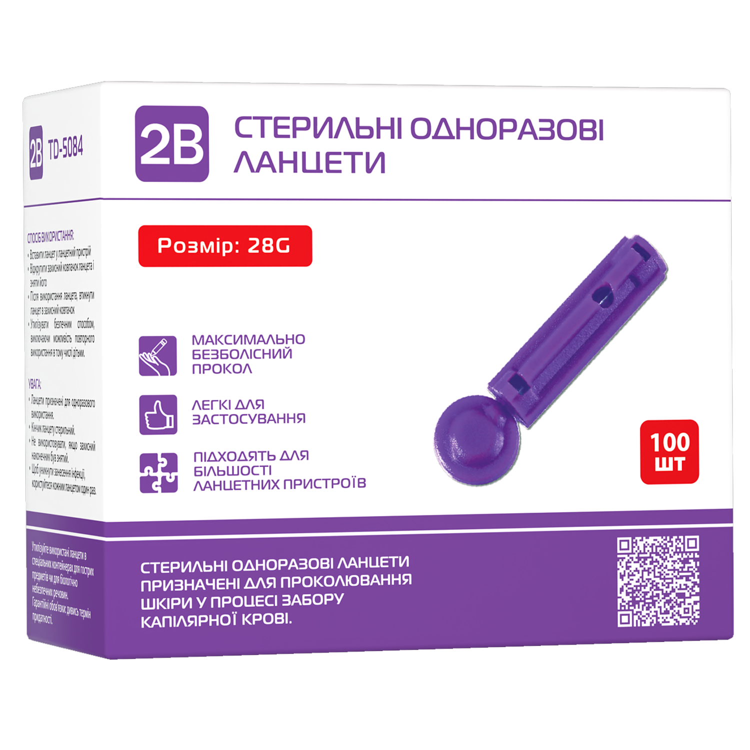 Стерильні одноразові ланцети 2В використовуються для забору крові в домашніх умовах з метою подальшого моніторингу здоров'я. За допомогою ланцетів, всього одним проколом, можна зібрати достатню кількість крові для визначення рівня вмісту в ній глюкози.