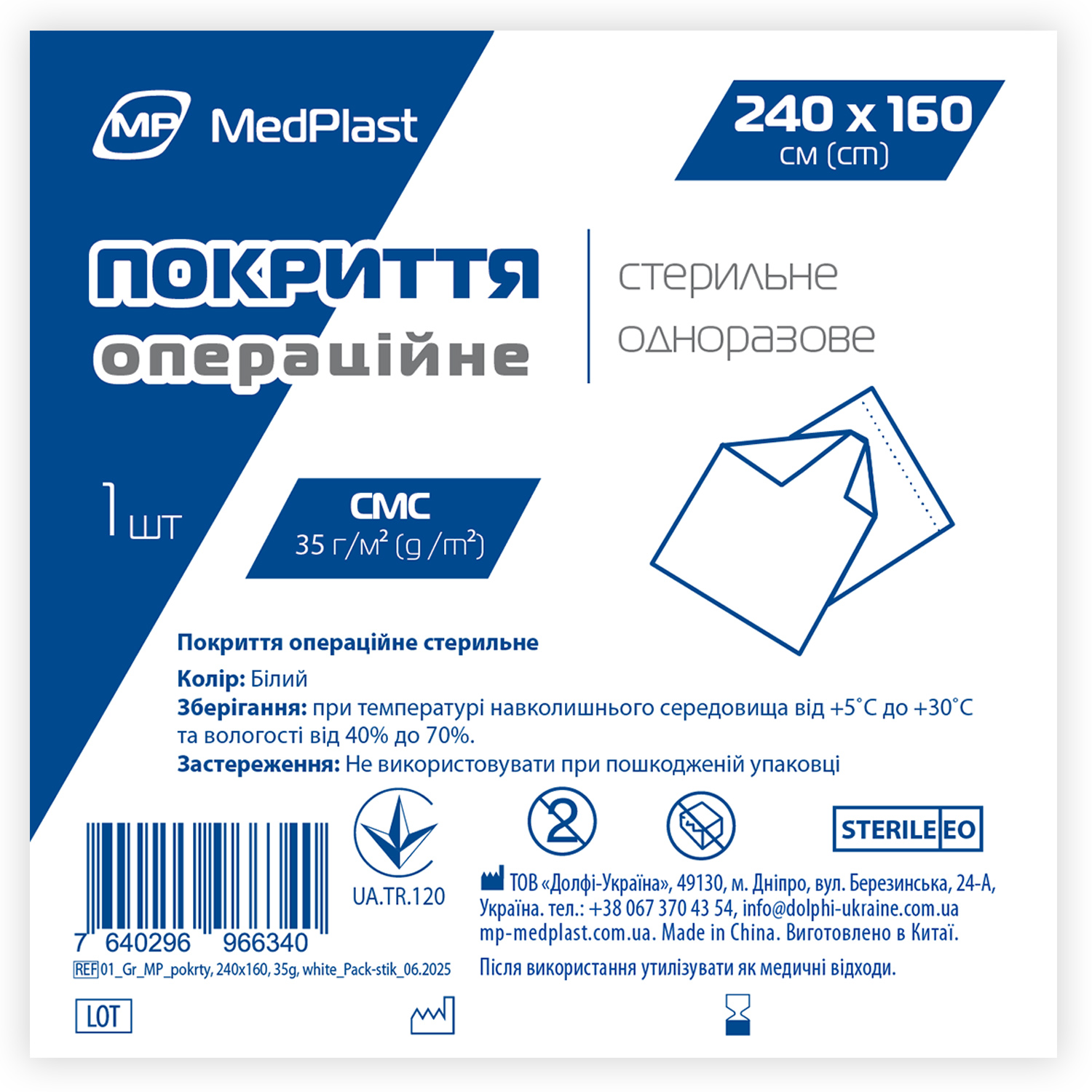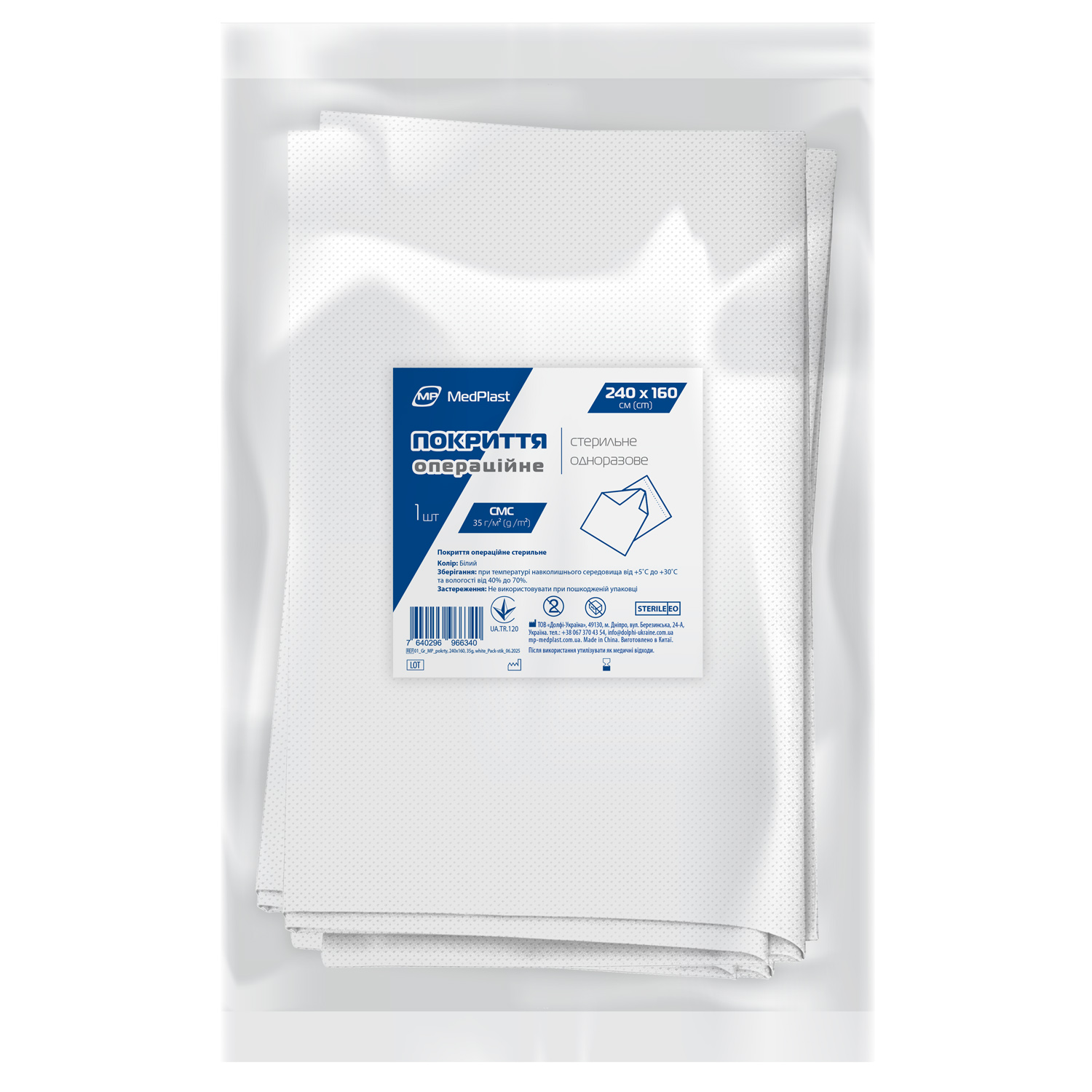 Покриття операційне стерильне MP MedPlast 240 см*160 см, СМС 35 г/м², білий