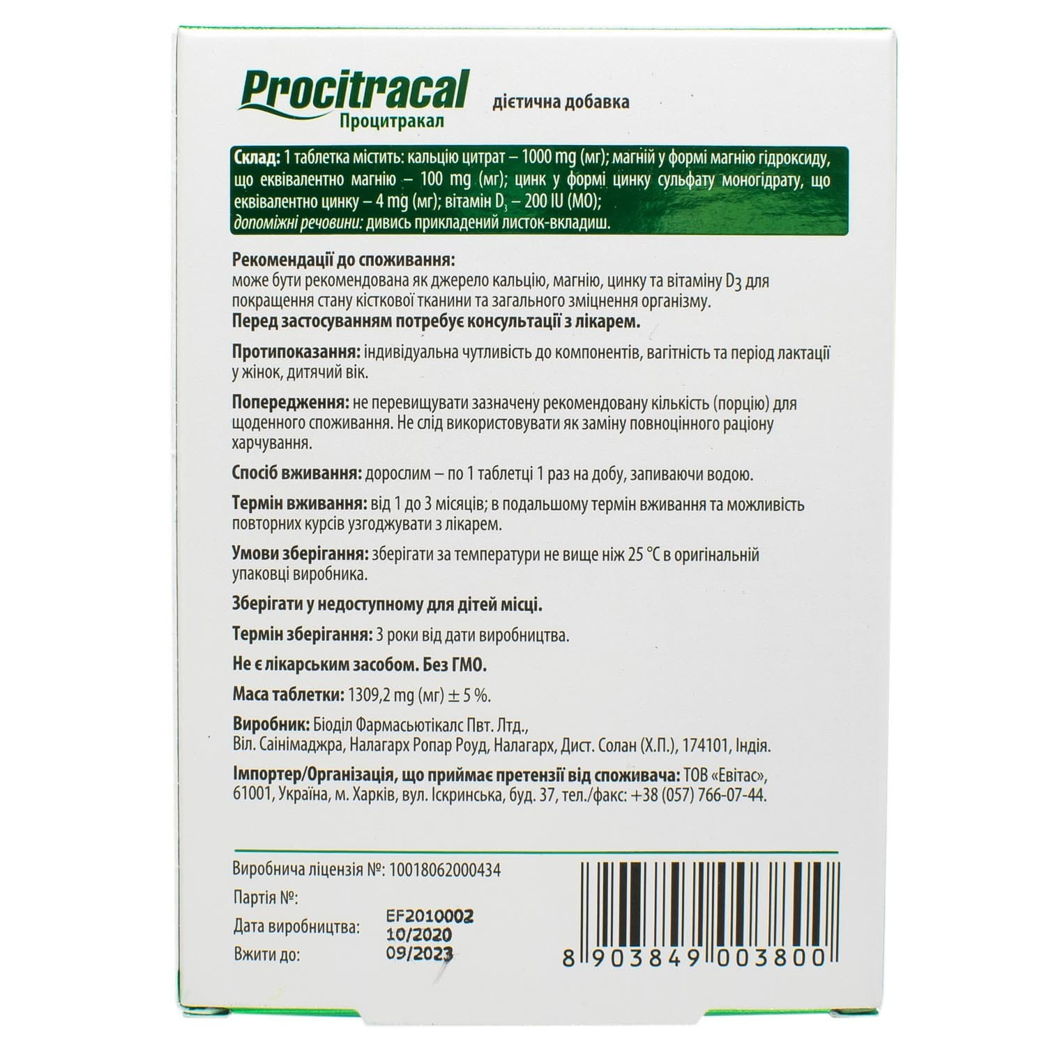 1 таблетка містить: кальцію цитрат – 1000 мг (mg); магній у формі магнію гідроксиду, що еквівалентно магнію – 100 мг (mg); цинк у формі цинку сульфату моногідрату, що еквівалентно цинку – 4 мг (mg); вітамін D – 200 МО (IU);