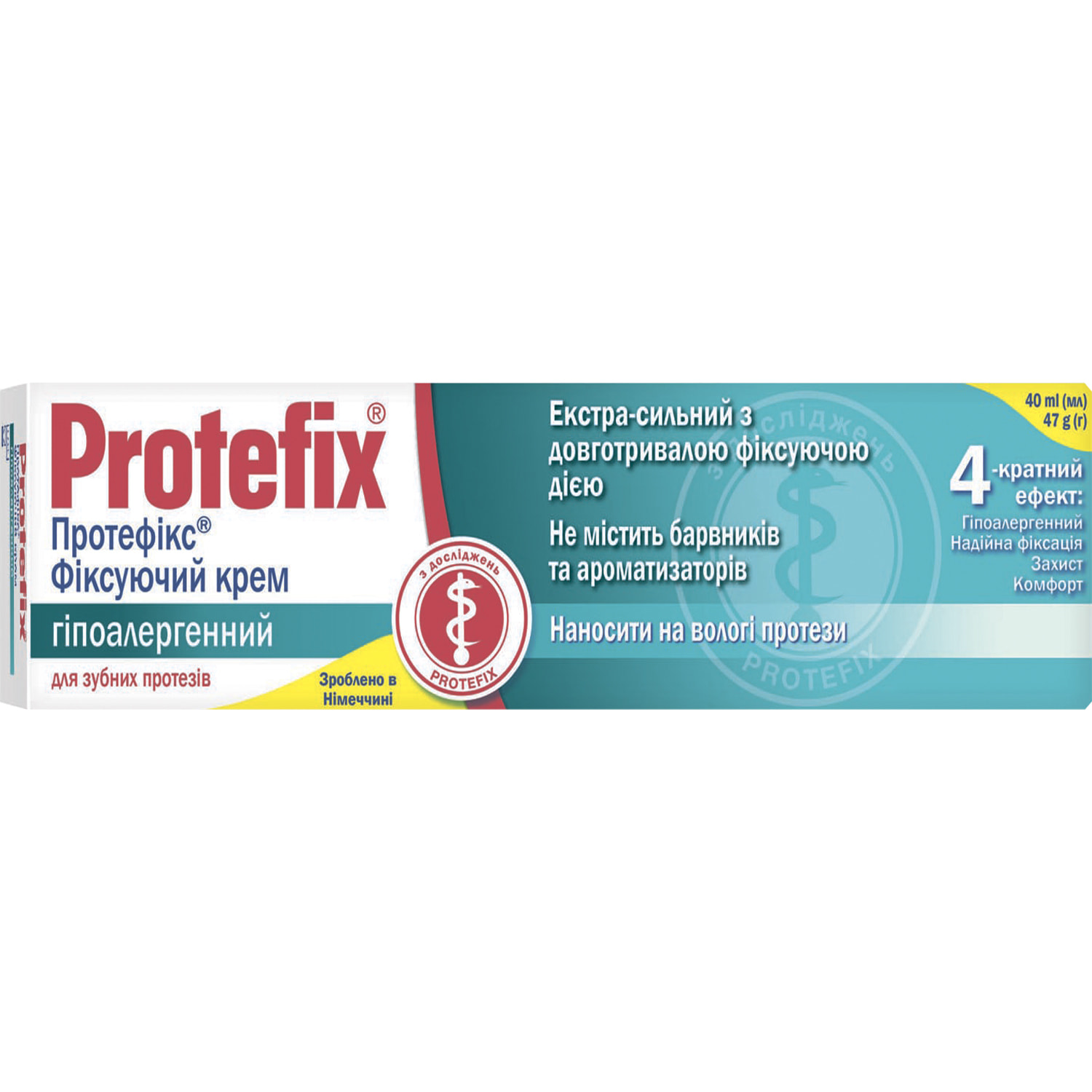 Перед використанням розім’яти тюбик. Протези та порожнину рота очистити від залишків їжі. На вологі протези нанести тонкою смужкою Protefix ® (Протефикс®) Фіксуючий крем гіпоалергенний (в заглиблення на зубних протезах верхньої та/або нижньої щелепи, які потім лягають на ясна). При необхідності можна нанести тонку смужку фіксуючого крему і на задню частину пластини протезу верхньої щелепи. Потім вставити протез і на декілька секунд притиснути до ясен. Сильна фіксація виникає, практично, відразу та триває протягом 8-12 годин.