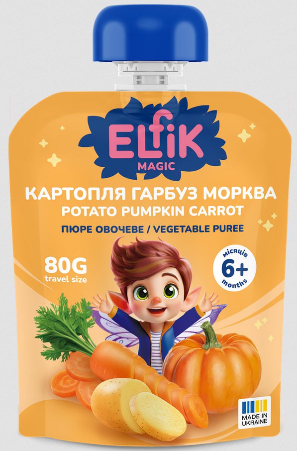 Склад: картопля (48 %), гарбуз (40%), морква (6 %),вода питна ,вітамін С.
