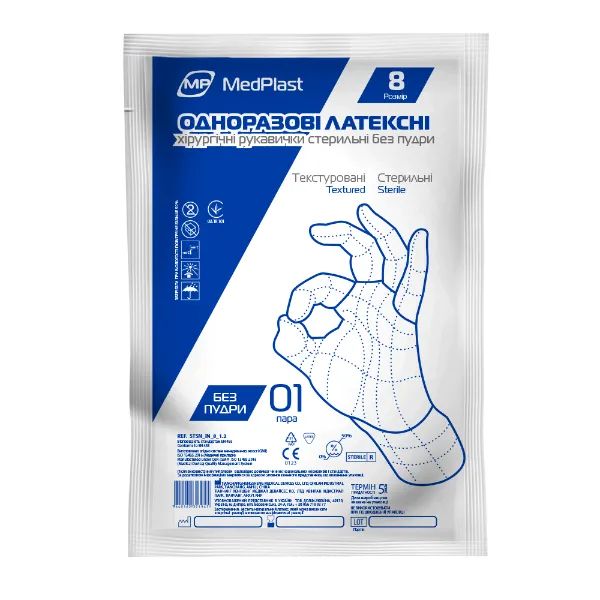 Рукавички хірургічні МedPlast стерильні латексні без пудри, розмір 8,0, 50 шт
