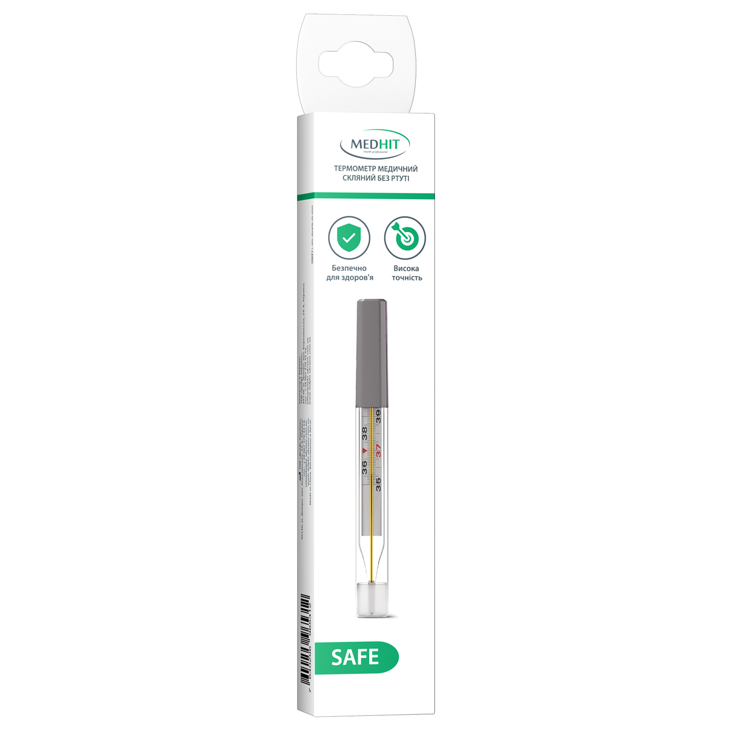 Термометр медичний скляний без ртуті це екологічно безпечний прилад для вимірювання температури тіла. В його основі лежить безпечний сплав галію, що заповнює кінчик скляної трубки і рівномірно змінює свій об’єм залежно від температури, а в середині трубки використовується забарвлений спирт.