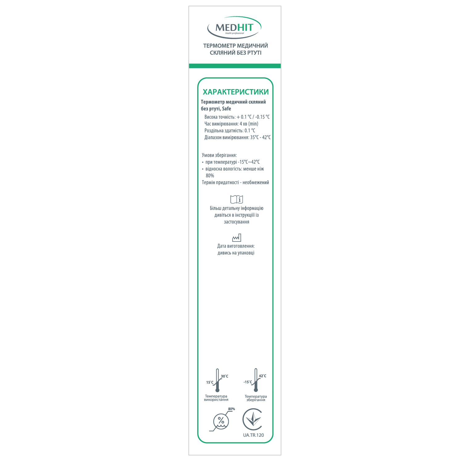 Термометр поєднує класичний дизайн з сучасними матеріалами, що повністю виключає ризики для здоров'я та довкілля у разі пошкодження приладу. Чітка шкала з великими цифрами забезпечує легке зчитування результатів, завдяки контрастному забарвленню стовпчика.