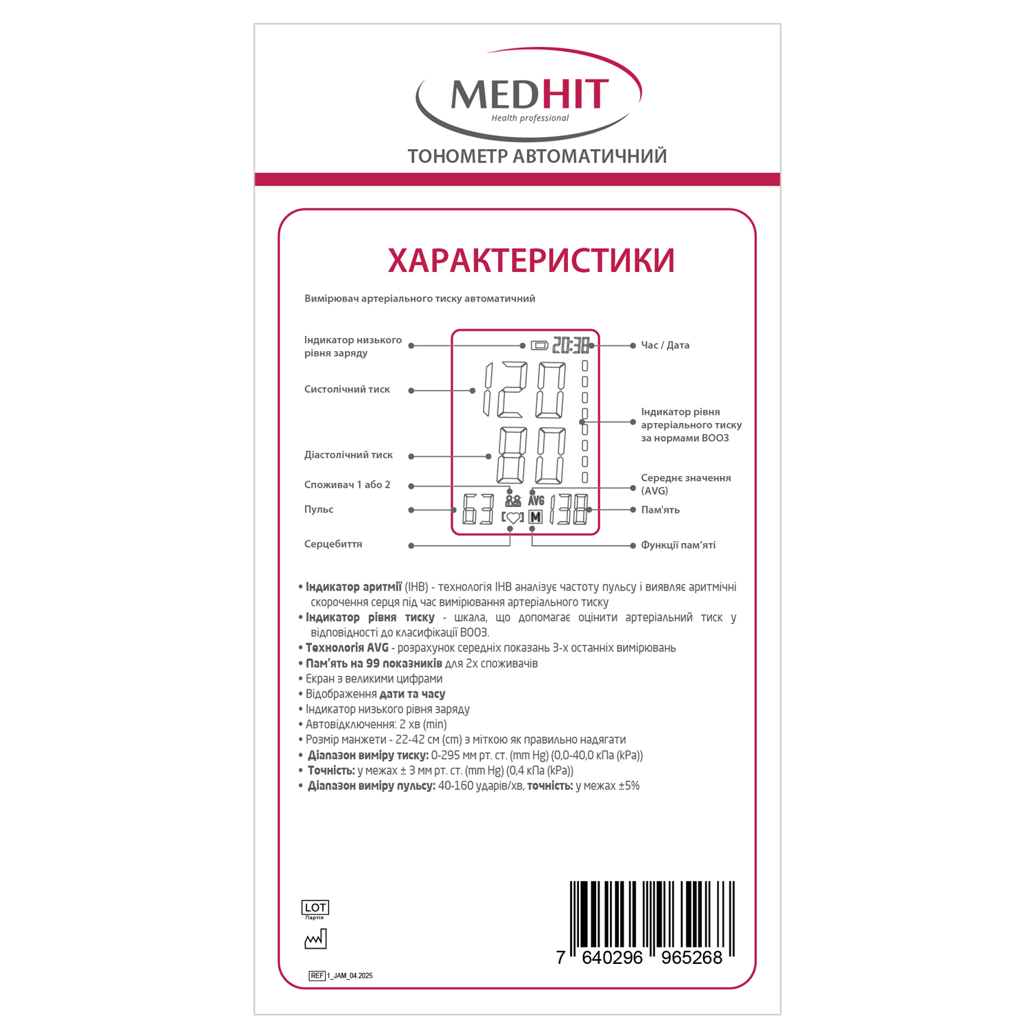 - Індикатор аритмії - технологія IHB аналізує частоту пульсу і виявляє аритмічні скорочення серця під час вимірювання артеріального тиску