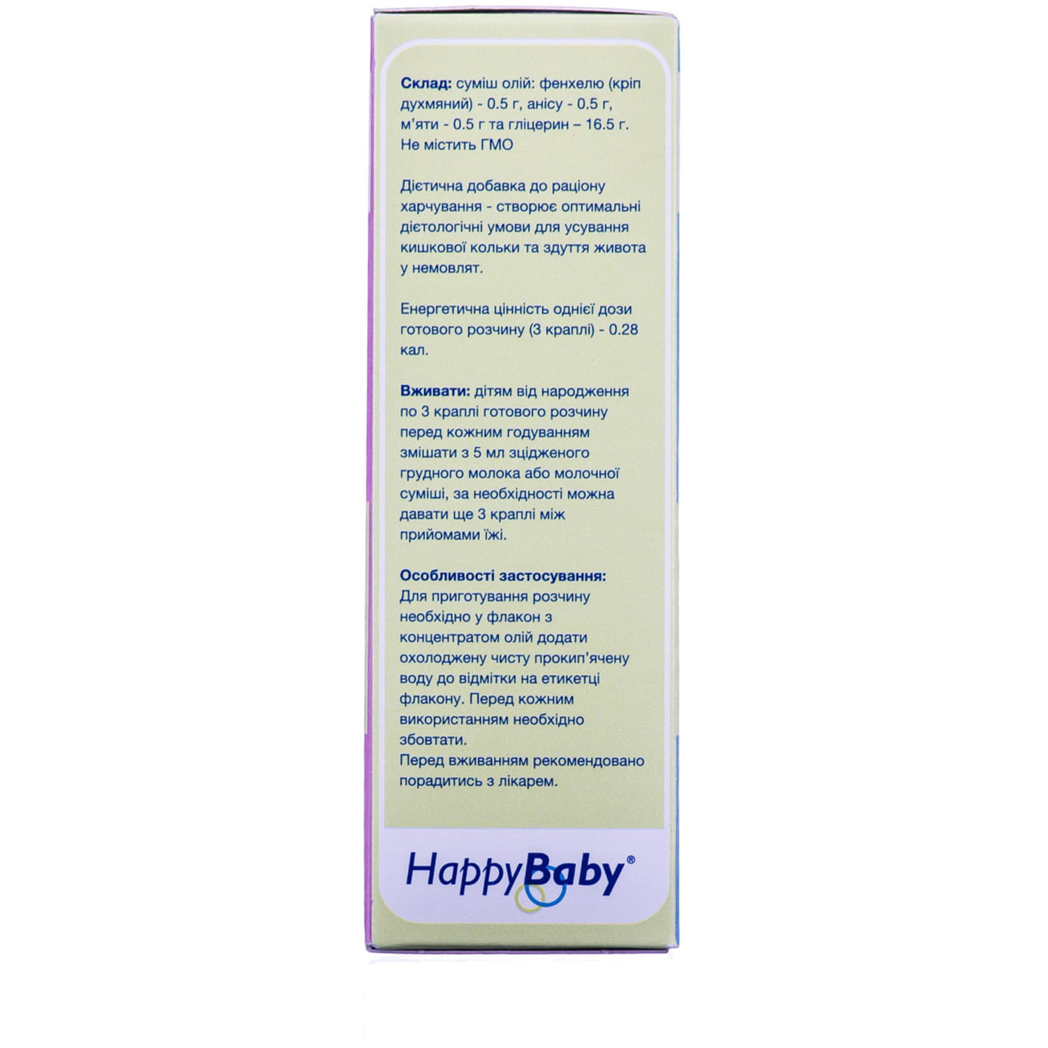 1 флакон: Масло з фенхеля (кріп пахучий) - 0,5 г, масло анісу - 0,5 г, масло м'яти - 0,5 г, гліцерин - 1 6,5 г. Енергетична цінність однієї дози готового розчину (3 краплі) - 0,28 кал.