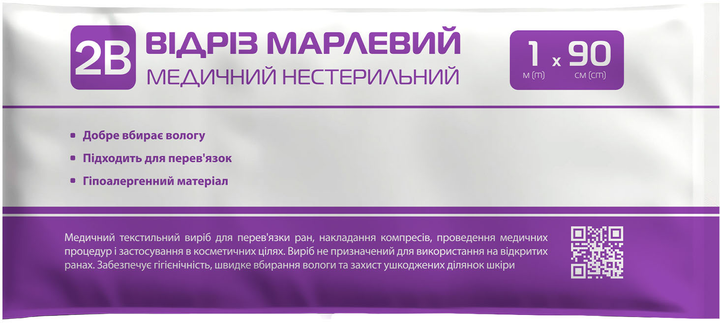 Відріз марлевий медичний нестерильний 2В — це багатофункціональний матеріал, який використовується для фіксації пов’язок, захисту та обробки подряпин й опіків чи накладання компресів. Це зручний варіант для щоденного застосування, підтримання гігієни та надання першої допомоги в будь-яких умовах вдома чи у спорті.