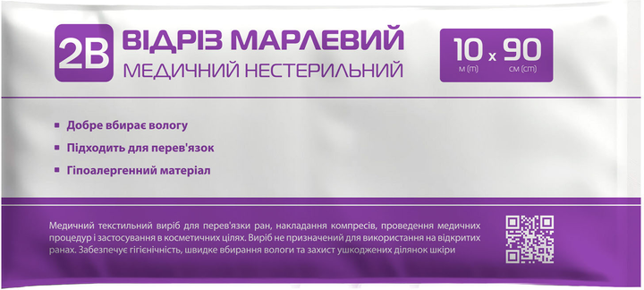 Відріз марлевий медичний нестерильний 2В — це багатофункціональний матеріал, який використовується для фіксації пов’язок, захисту та обробки подряпин й опіків чи накладання компресів. Це зручний варіант для щоденного застосування, підтримання гігієни та надання першої допомоги в будь-яких умовах вдома чи у спорті.
